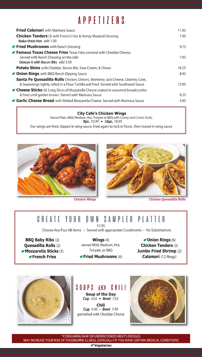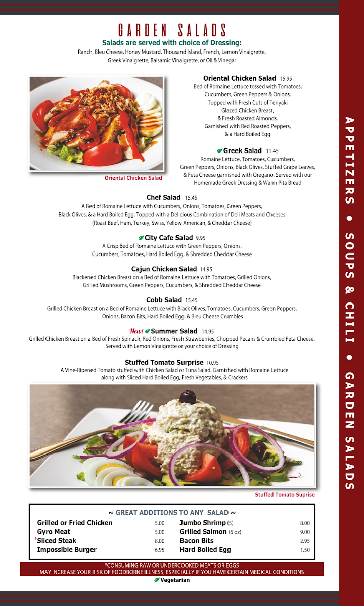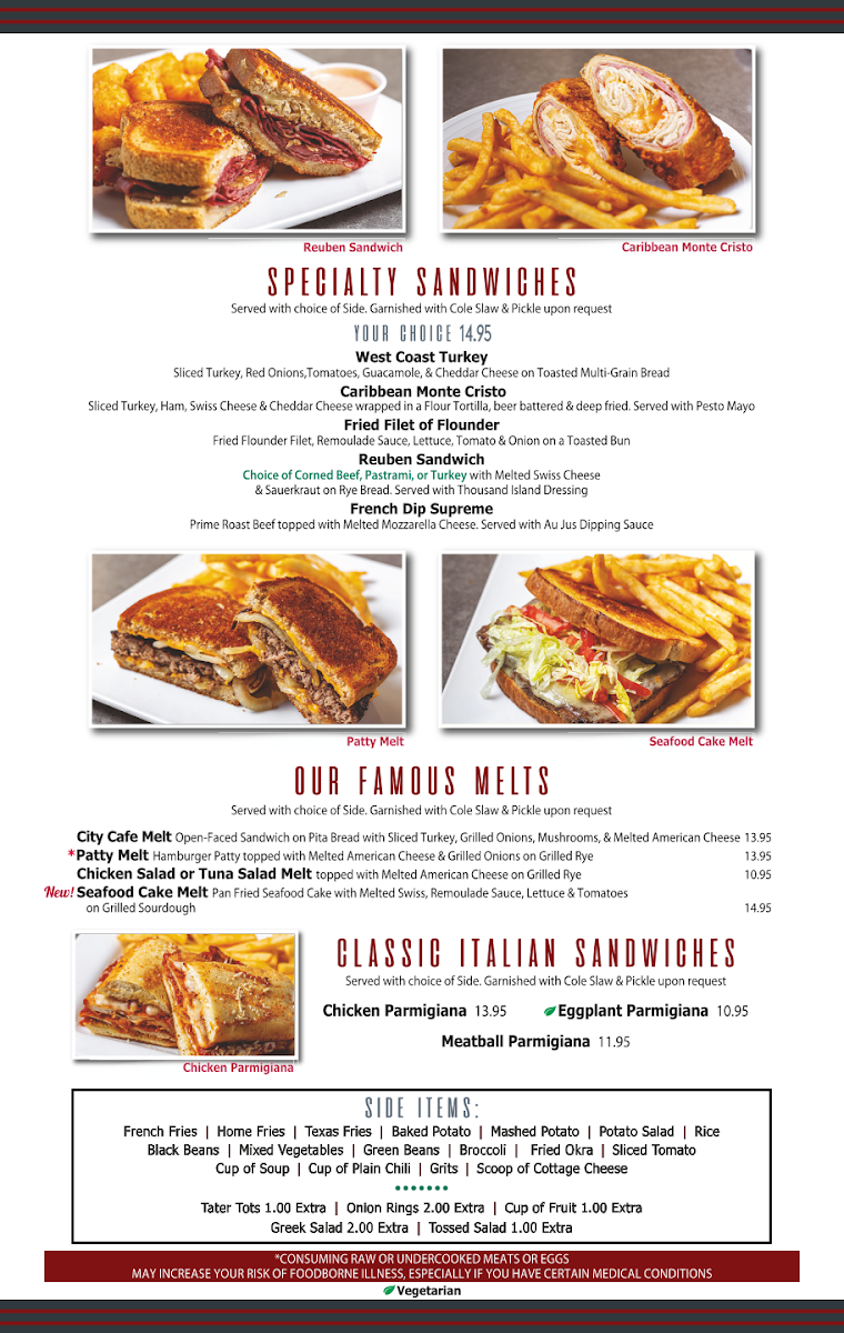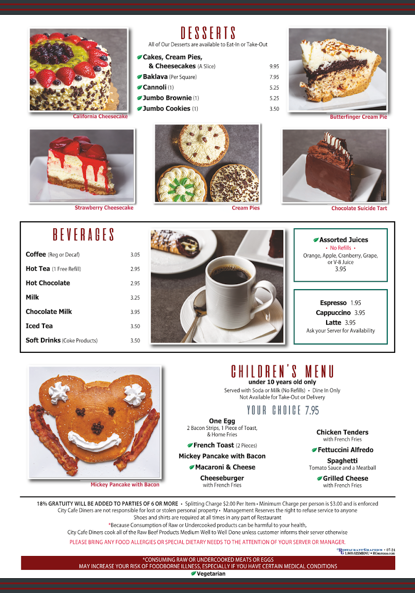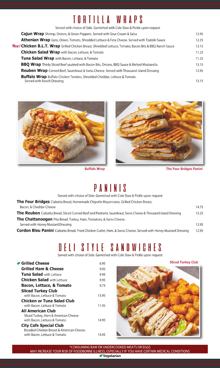 Located at 7641 Lee Hwy in Chattanooga, TN, the City Cafe Diner Menu brings you a delightful mix of classic comfort food and fresh, hearty options that will make you feel right at home. Whether you're in the mood for a quick bite or a leisurely meal, this diner has something for everyone. From their signature burgers and crispy fries to warm breakfast options served all day, each dish is prepared with care and the finest ingredients. For those looking for a lighter bite, the menu also features fresh salads, sandwiches, and wraps, all paired with a variety of delicious sides. The friendly atmosphere and welcoming service make it the perfect spot to grab a meal with friends or family.