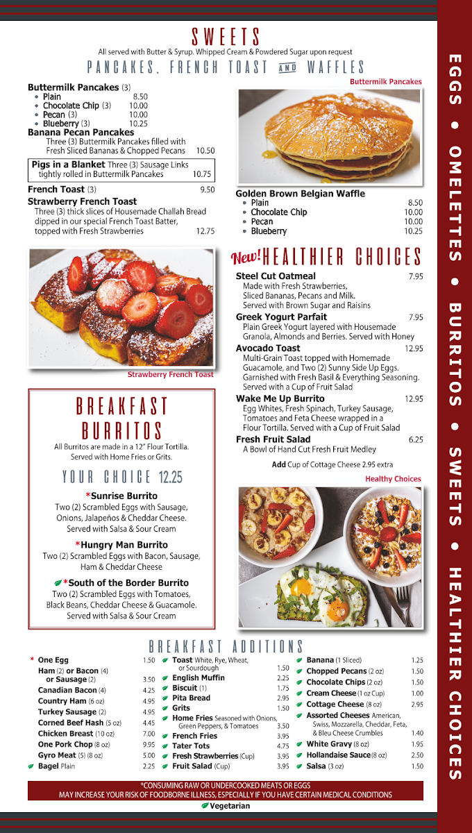 Thick-cut slices of rich, buttery brioche bread carefully dipped in our signature vanilla-scented custard batter made with farm-fresh eggs, pure vanilla extract, and a touch of cinnamon, then griddled until beautifully golden brown and perfectly crispy on the outside while remaining fluffy and custardy on the inside. Generously topped with our house-made strawberry compote featuring fresh, ripe strawberries simmered with a touch of sugar until they create a luscious, jammy sauce that's both sweet and bright. Finished with a delicate dusting of powdered sugar that adds visual appeal and extra sweetness, served alongside fluffy whipped cream and warm, pure Grade A maple syrup for the ultimate indulgence. This decadent brunch specialty at City Cafe Diner transforms the beloved classic French toast into an extraordinary treat that's perfect for special occasions, weekend celebrations, or when you simply want to treat yourself to something truly memorable.