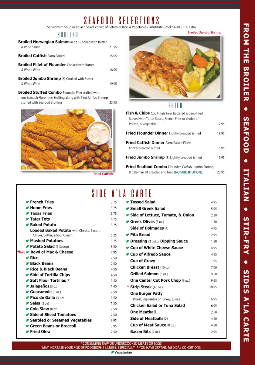 Indulge in the ultimate dining experience with City Cafe Diner's signature Surf and Turf platter, the crown jewel of our menu that satisfies even the most discerning palates. We start with a hand-selected 8-ounce Angus beef tenderloin, aged to perfection and seasoned with our house dry rub before being flame-grilled to your exact specification. The steak delivers complex, robust flavors with a caramelized exterior giving way to a juicy, tender center. Alongside this premium cut, we present four jumbo Gulf shrimp, carefully cleaned and deveined, then sautéed in a rich garlic butter sauce infused with white wine, fresh herbs, and a hint of lemon zest. The succulent sweetness of the shrimp provides the perfect complement to the hearty steak. This exceptional restaurant offering is accompanied by roasted seasonal vegetables harvested from local farms when available, and your choice of Yukon gold mashed potatoes, twice-baked potato, or herb-roasted fingerlings.